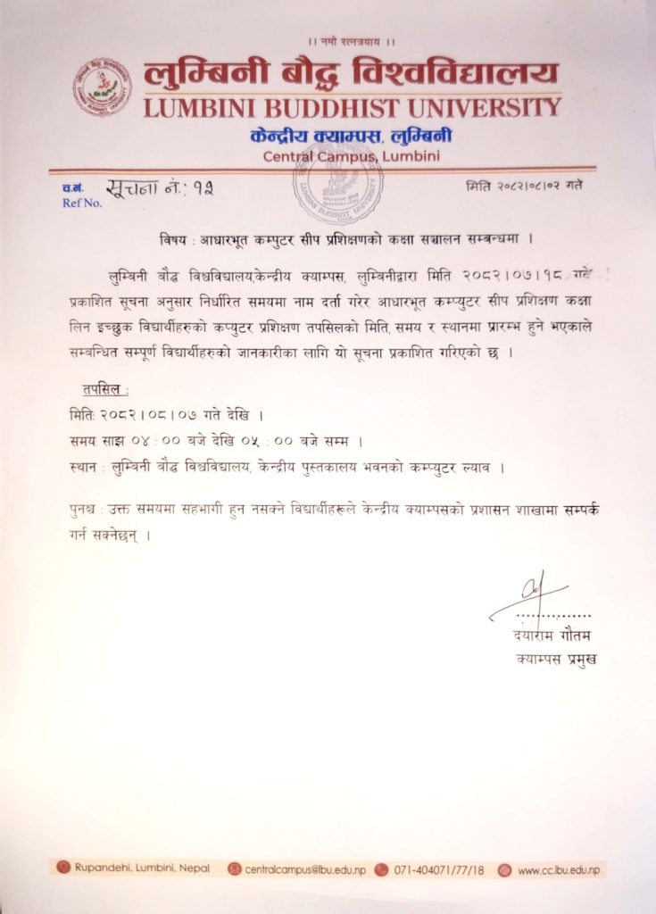 आधारभूत कम्पुटर सीप प्रशिक्षणको कक्षा सञ्चालन सम्बन्धमा । Uncategorized आधारभूत कम्पुटर सीप प्रशिक्षणको कक्षा सञ्चालन सम्बन्धमा । Vijay Singh November 18, 2025 0 comments परीक्षा आवेदन फारम भर्ने सम्बन्धी सूचना । Related Posts परीक्षा आवेदन फारम भर्ने सम्बन्धी सूचना । November 17, 2025 अनलाईन परीक्षा आवेदन फाराम भर्ने सम्बन्धी सूचना । November 12, 2025 छात्र वृतीका लागि आबेदन पेश गर्ने सम्बन्धमा सूचना सच्याईएको सम्बन्धमा । November 5, 2025 स्वागत छ, लुम्बिनी बौद्ध विश्वविद्यालय केन्द्रीय क्याम्पसमा।। October 8, 2025 सूचना, सूचना, सूचना September 22, 2025